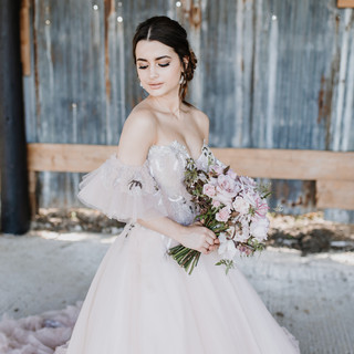 Our pink princess ballgown really speaks for itself! With its unusual colour and vertical ruffle skirt, this dress is bringing all the drama. It's super feminine and makes you feel incredibly confident and powerful. Definitely not your traditional wedding dress, but if you like to make a statement and break away from the norms, maybe it's the one for you. The soft up-do with face framing pieces adds to the romance of the look.