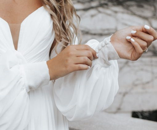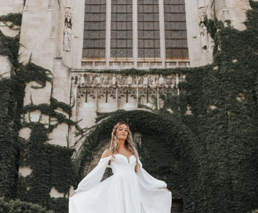 Get swept away in Style D3636, a romantic A-line wedding dress draped in soft layers of delicate chiffon. The notched plunging neckline accentuates the soft pleating of the romantic wrapped bodice. Detachable off-the-shoulder blouson sleeves add a luxe detail for this versatile wedding look, which can also be worn strapless. The clean and simple aesthetic is made complete with a soft A-line skirt that floats and sways with every movement, with a side slit detail and head-turning train.