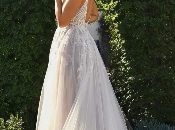 Sheer and sparkling, Style D3799 blends modern fashion elements with sexy designer details. From the beaded spaghetti straps, a deep V-neckline plunges into the bodice to match the illusion tulle-lined side cutouts on either side of this alluring sheer bodice. In the back, a deep scoop back detail meets the waistline for a super low open back outlined in sparkling lace accents. Past the waist, the embellished lace tendrils thin into an ethereal sea of sparkle tulle to form a full and frothy A-line skirt and train.