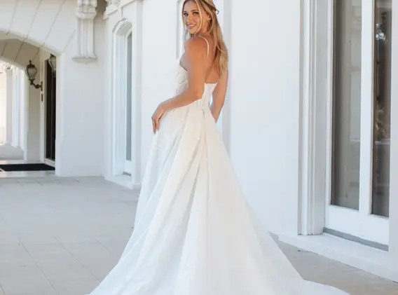 Shimmering in romantic lace applique and sparkling tulle, Style D3812 is an enchanting A-line wedding dress made for the modern princess. From intricately beaded spaghetti straps, a sweetheart neckline and corset-style bodice is enveloped in embellished lace for a timeless bridal look. Soft pleats drape from the waist to form a flowing A-line skirt that opens at the thigh with an on-trend leg slit. For the finishing touch, the glitter tulle skirt extends into a sweeping train trimmed in ornate lace applique.