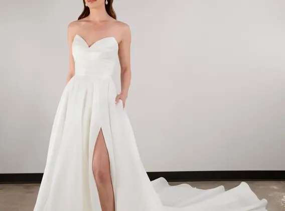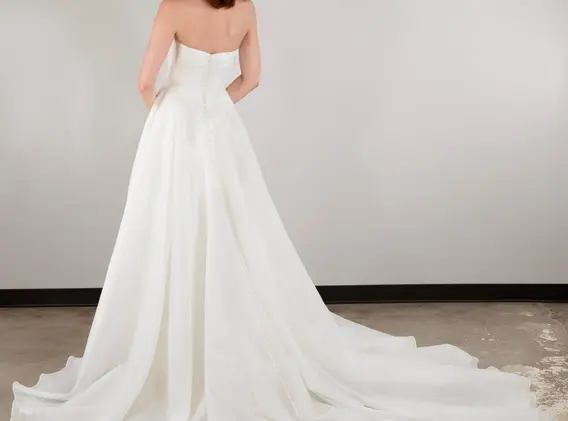 Equal parts sophisticated and daring, Style D3941 lets the modern bride express her inner fashionista. A strapless draped bodice wraps the figure in a designer-constructed fit before billowing out into a full, voluminous ballgown skirt with a high leg slit. High-shine foil organza fabric catches the light with each movement, adding an opulent touch to balance the alluring sheer bodice and skirt. Exuding contemporary glamour in every detail, this classic ballgown is transformed into a showstopping unparalleled look to remember forever.