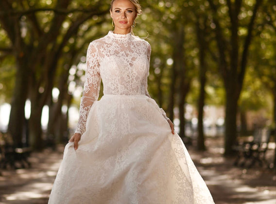 Timelessly romantic, this modest princess wedding dress is an enchanting bridal look for that special bride. Style D4028 features long lace sleeves and a high mock neckline in sheer floral lace with a classic sweetheart neckline in the bodice underneath, available in both lined and unlined options. In the back, a stunning teardrop keyhole back detail makes a statement down the aisle. From the waist, a full princess ballgown skirt floats away from the body from gentle pleats, highlighting the gorgeous floral lace overlay throughout. Refined and elegant, this Chantilly corded lace ballgown offers an unforgettable wedding day look for the modest princess bride.