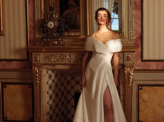 Stretch Mikado A-line featuring wide off the shoulder cuff accented with pleating on the front. Asymmetric pleating on skirt leads to a slit. Finished with pockets and Mikado covered buttons to end of chapel length train.