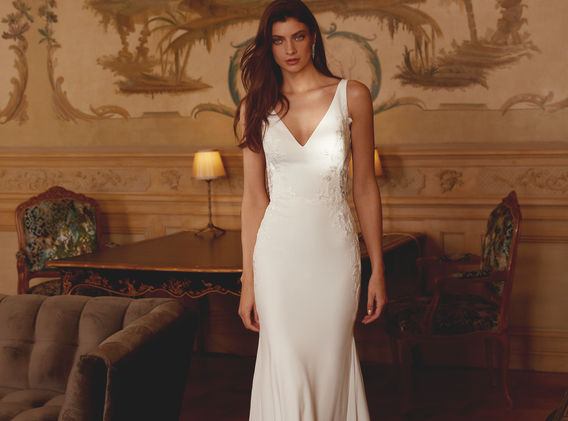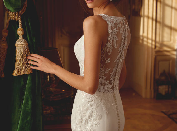 Stretch crepe fit and flare gown with V-neckline. Features illusion side cutouts and back details with sequin lace appliques throughout the bodice and skirt to the top of the chiffon side godets. Finished with buttons that start at the top of the illusion back to the top of the train details. Complete with sequin lace appliques at the front of the skirt hem and along the chapel length train.