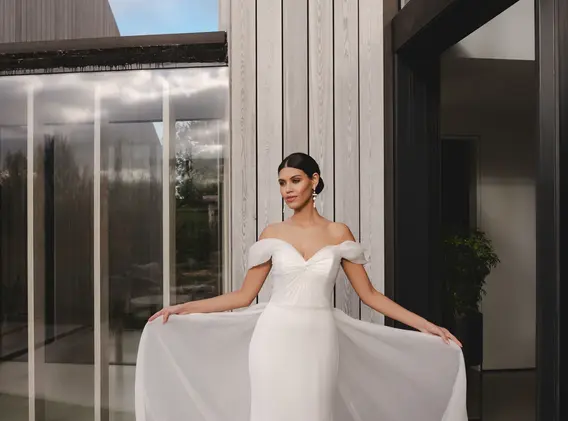 Introducing our newest most luxurious crinkle chiffon, this fabric is like no other. Paired with our renowned luxe crepe, the Jude wedding dress is elegant and romantic in equal measure. The feminine open neckline with dreamy bardot sleeves is balanced beautifully with our signature Love Story London fitted silhouette.