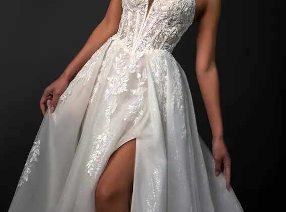 For the bride who dreams of a modern day fairytale, Style 1833 combines princess-inspired romance with a sexy, sophisticated edge. This romantic lace bridal gown features shimmering beaded spaghetti straps that connect to a sheer corset-style bodice and plunging notch neckline. Glittering beaded accents dance across leafy floral appliqué lace, cascading over the basque waistline and seamlessly transitioning into the full A-line skirt of glittering tulle, with pockets and a sexy leg slit for a modern touch.