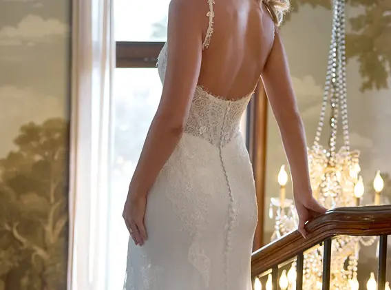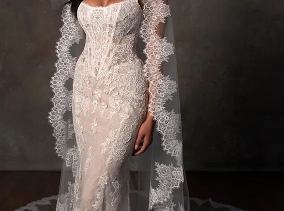 Style D4437 is a romantic revival of old-world elegance, blending vintage-inspired details with a refined silhouette. Crafted in lace and tulle, this fit-and-flare gown features a soft scooped neckline with lace-shaped straps and a structured bodice with corset boning for subtle definition. A delicate Chantilly lace underlay adds texture beneath matte floral lace appliqués, while the Basque waist elongates the frame with a nod to classic design. The look finishes with a scalloped lace-shaped train, offering a dramatic and graceful finish for the bride drawn to timeless craftsmanship and beauty.